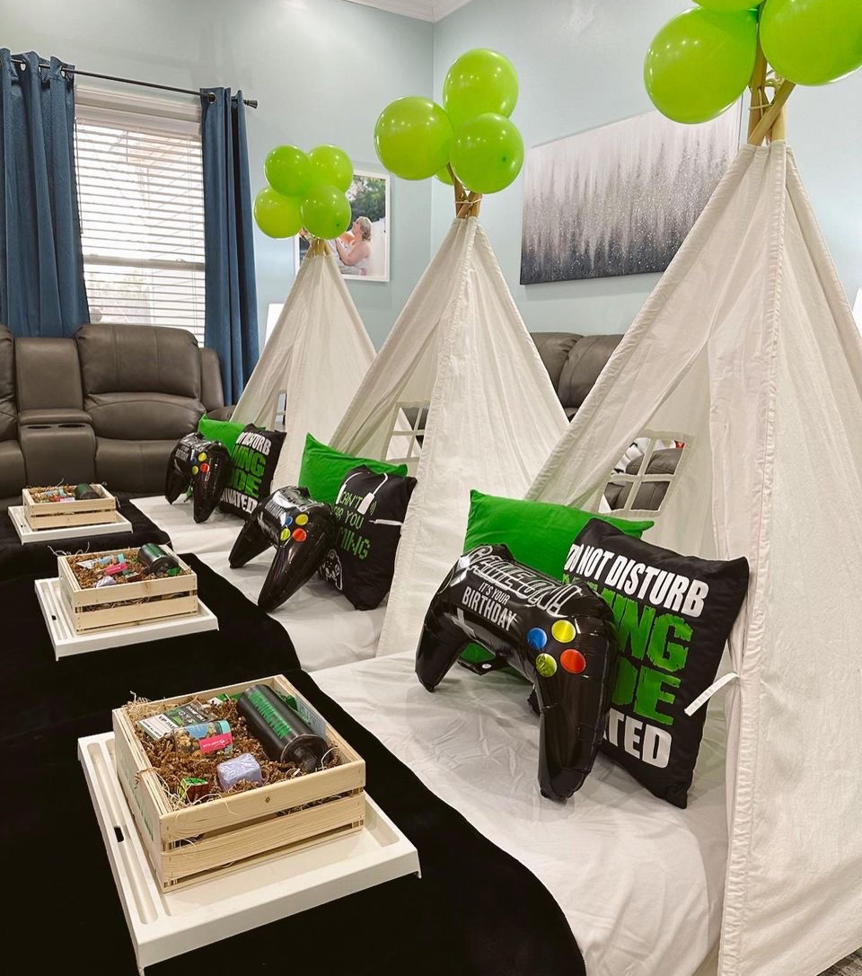 Includes tents, mattresses, bedding, lighting, décor pieces, and instruction guide.
